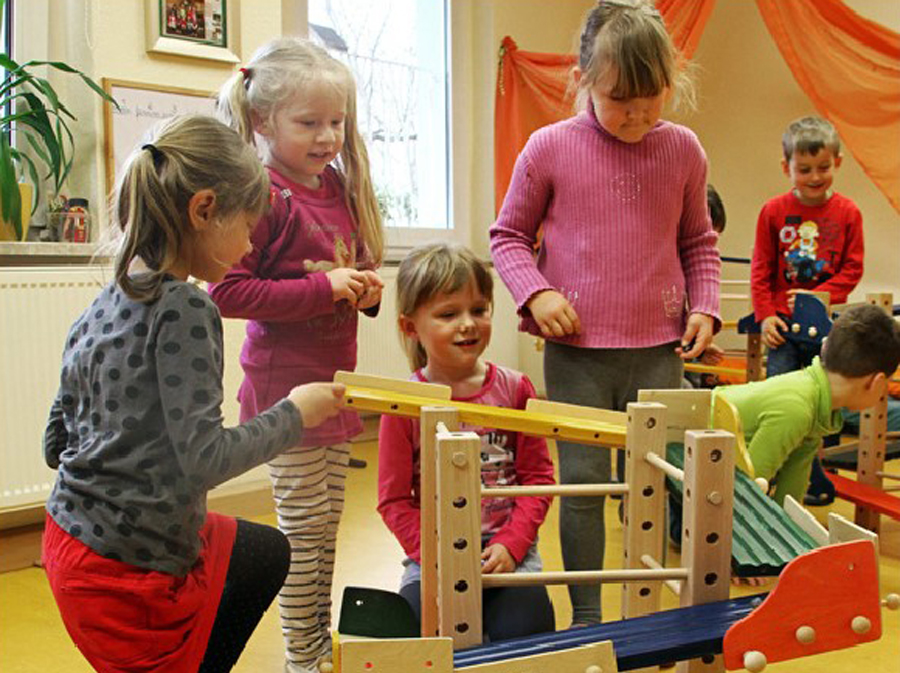 Beim angeleiteten Aufbau sind jeweils vier bis sechs Kinder in Teamarbeit an einem Murmelturm beschäftigt. Dabei wird immer wieder das Zählen geübt, da die Rundstäbe auch in die richtigen Löcher der Pfosten gesteckt werden müssen.